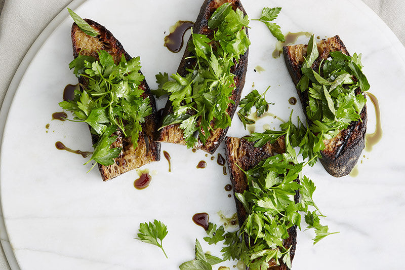 3. Arrange toast on a platter or large cutting board and drizzle generously with black pumpkin seed oil. Top with the parsley salad and serve.