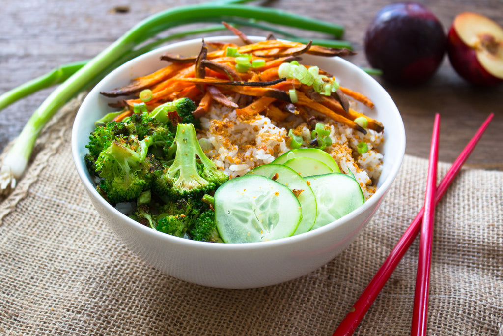 Sprinkle 2 Tbsp. togarashi and a pinch of salt over the rice and stir to combine. Divide among 2 bowls and top evenly with the cucumber, broccoli, sweet potatoes, scallions and mizuna. Season each with the remaining togarashi and a pinch of salt and pepper to taste.