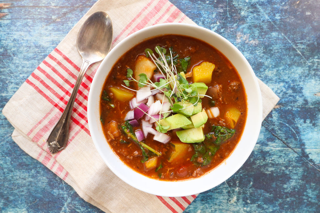 Heat olive oil in soup pot set over medium-high heat. Add carrots, onion, peppers, and potatoes, and sauté 7 minutes until slightly golden. Remove veggies from pot and add ground turkey. Break it up with a wooden spoon and cook turkey until nicely browned. Return sautéed vegetables to pot along with collards, if using, crushed tomatoes, garlic, and broth. Season with sea salt and pepper (and a bit of chili powder, if you like) and simmer 20-30 minutes until potatoes are soft and chili thickens. Taste and adjust seasonings and sea salt as necessary. Divide between bowls and top with a sprinkle chili powder and your favorite chili toppings, such as avocado or sour cream.