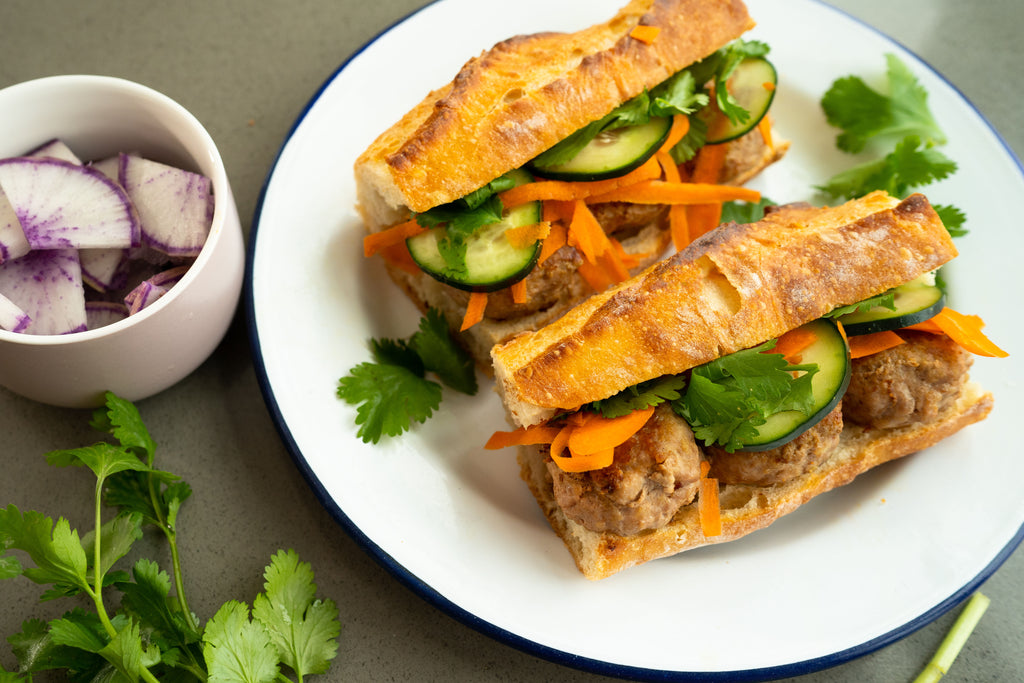 Spread the spicy mayo on one side. Arrange 3 meatballs on each sandwich and top with drained pickled vegetables and cilantro leaves.
