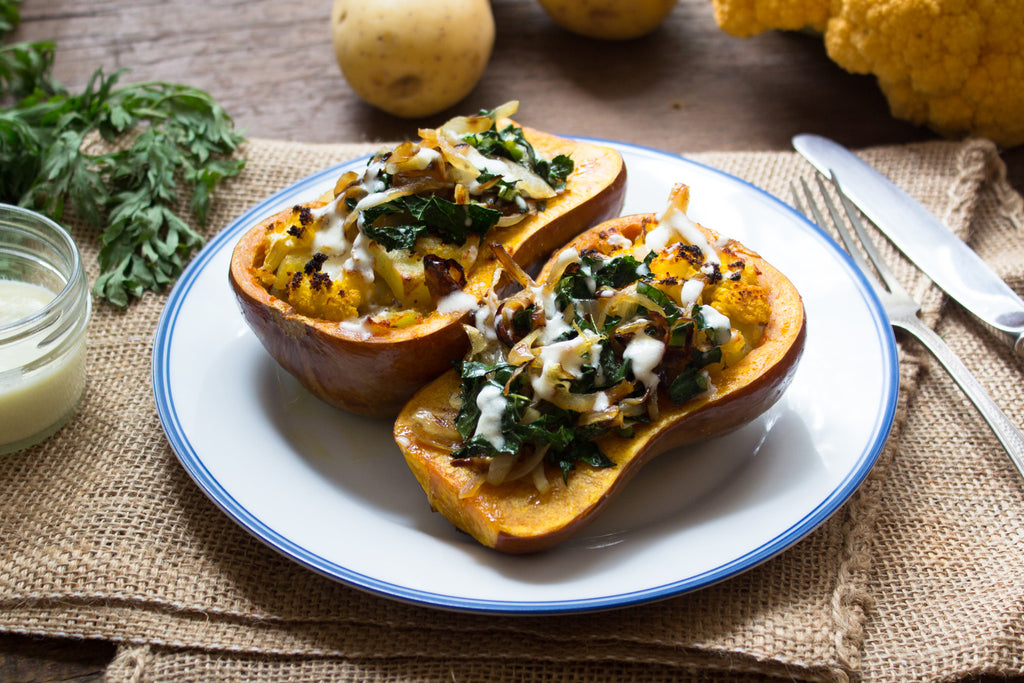 Scoop out the squash, leaving 1/2" of flesh surrounding the skin, and place into a large mixing bowl along with the cauliflower and onions. Add the butter and gently mash together, seasoning with a pinch of salt and pepper. Add the kale and stir to combine. Stuff the squash halves with this potato mixture and return to the oven for another 10 minutes until slightly browned. Divide among 2 plates and garnish with the yogurt sauce.