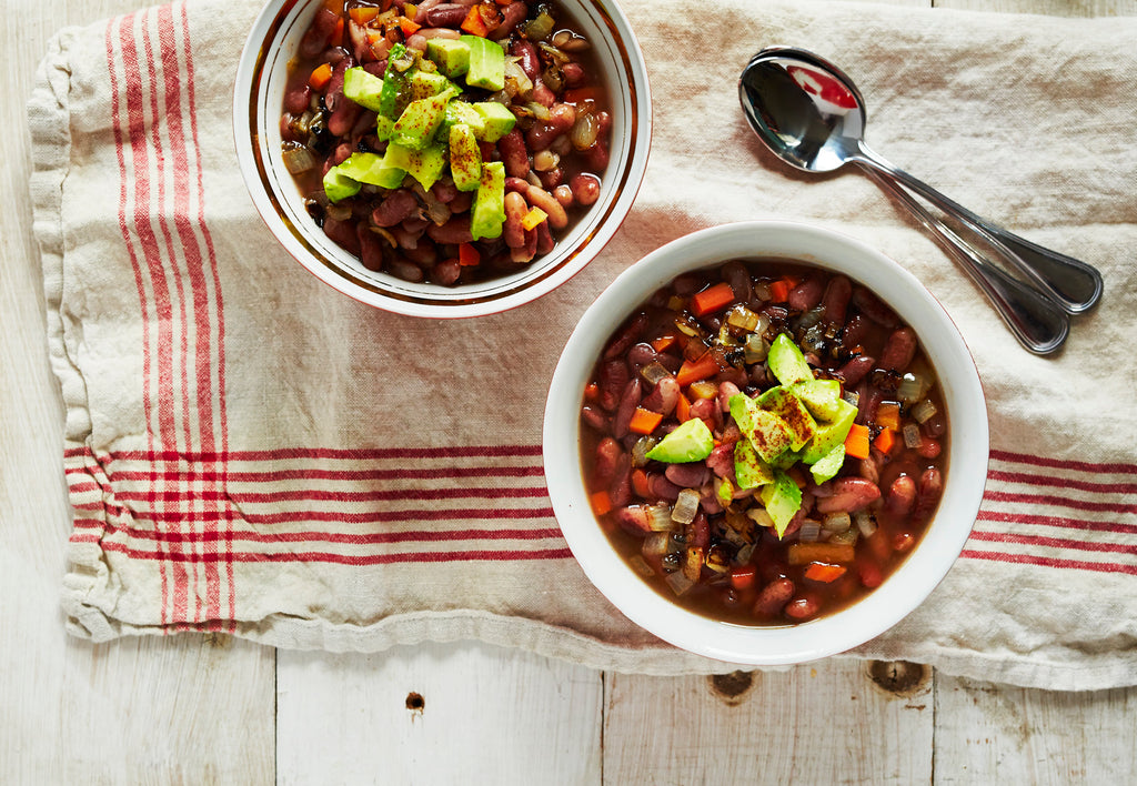 Add beans to pot along with crushed tomatoes and stock or water. Lower heat and simmer 30 minutes, partially covered, until beans are meltingly tender. At this point, transfer 1½ cups chili to blender, making sure to include some of liquid; purée until smooth, then add back in. This will add body to chili. You can also mash some beans with potato masher. Season with sea salt and pepper, divide between bowls, and garnish with diced avocado.