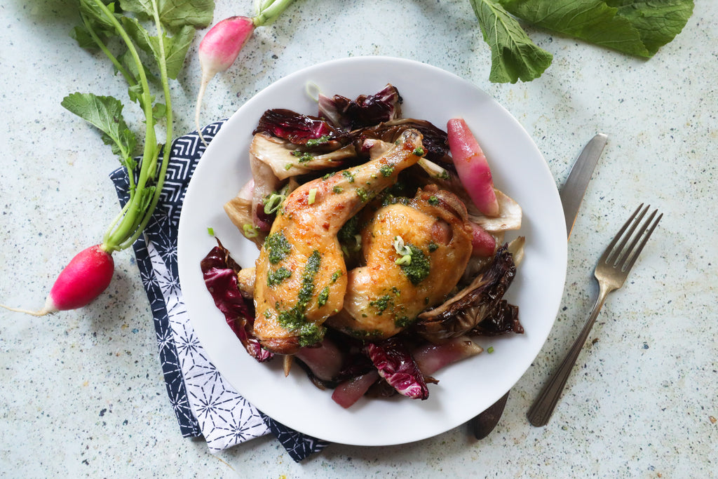 Insert a knife between thigh and breast, gently pulling leg away to separate chicken into two pieces. Serve over treviso and radishes along with scallion radish top pesto.