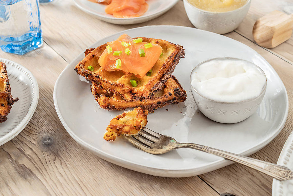 Serve the potato waffles hot with smoked salmon, sour cream and apple sauce.