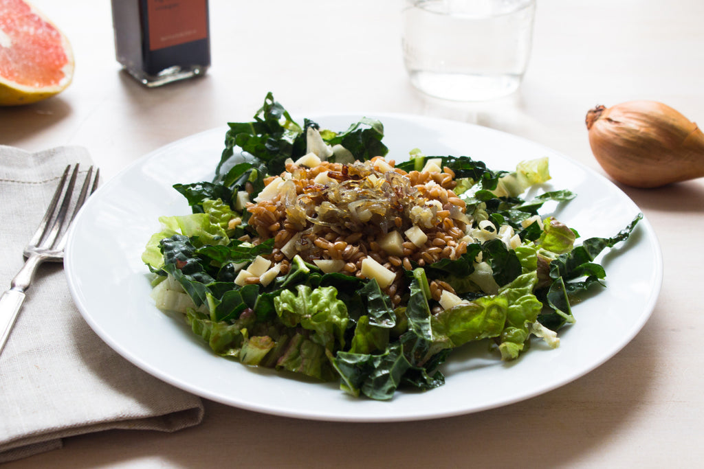 Toss salad mix with half the shallot vinaigrette, and the warm grains with the other half. Create a bed of dressed greens, then top with about a cup of dressed grains. Sprinkle with crispy shallots. If you’re looking for an extra hearty meal, top the salad with a poached egg.