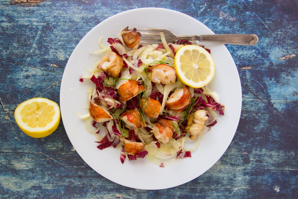 Prepare the lobster tails by patting them dry and laying them flat on a cutting board. Using a sharp knife and starting from the flippers, cut through the shell all the way along the top. Peel off the whole shell. Heat the butter of ghee in medium sauté pan. Sear the lobster meat for about 6 minutes, turning frequently. Remove lobster from pan and toss with fennel radicchio salad. Serve immediately.