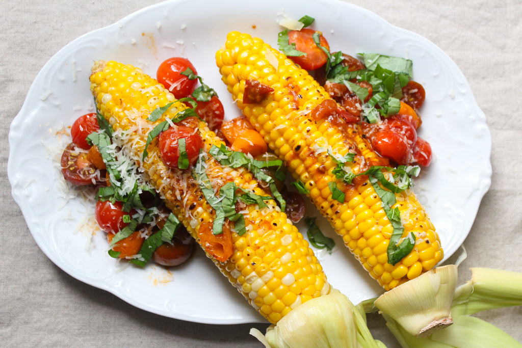Place corn on platter and spoon roasted tomatoes over it. Garnish with basil and cheese. Serve immediately.