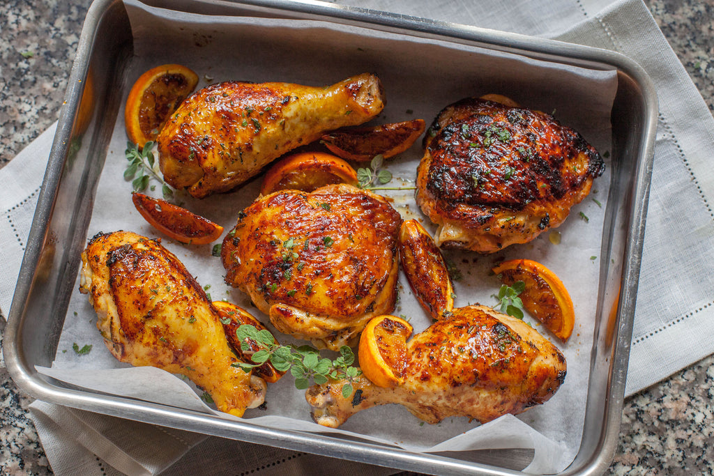 Preheat the oven to 375 degrees. Remove the chicken from the marinade, wipe off any excess yogurt (a little bit of yogurt remaining is ok!) and sprinkle with the chopped oregano. Heat a large skillet over medium-high heat. Once the skillet is hot, add two tablespoons of olive oil. Reduce heat to medium and place the chicken in the pan, skin side down. Let the skin sear until it is golden brown, about 5 to 7 minutes. Turn the chicken over and place the pan in the oven to finish roasting, about 20-25 minutes more, or until the juices run clear and a thermometer reads 145-150 degrees.