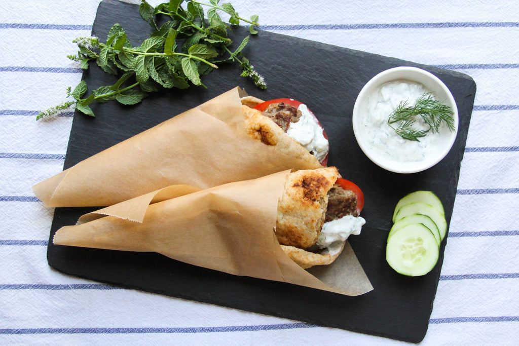 In another bowl, stir together the ground lamb, red onion, za’atar and a pinch of salt. Shape into 4 long skinny loaves or “kefta.” In a large skillet over medium heat, heat the olive oil until hot. Add the kefta and brown all over, until no longer pink inside, about 12 minutes.